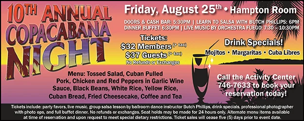 The biggest party of the summer will definitely be the 10th Annual Copacabana Night on Friday, August 25 in the Hampton Room. This year, the event will feature a menu of Cuban Pulled Pork, Chicken and Red Peppers in Garlic Wine Sauce, and some delicious sides.