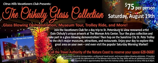 The Citrus Hills Vacationers Club is also planning a trip to St. Petersburg to see The Chihuly Glass Collection by artist Dale Chihuly at The Morean Arts Center. In addition to exploring the glassblowing exhibit, there will be plenty of time to venture out and see other popular St. Petersburg attractions.
