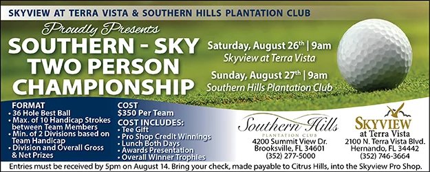 The big golf event of August will be the Southern-Sky Two Person Championship that will start at Skyview at Terra Vista on Saturday, August 26 and conclude at Southern Hills Plantation Club on Sunday, August 27. If you would like to participate in this unique pairs tournament that covers two different courses, you must register with the Skyview Pro Shop by August 14.