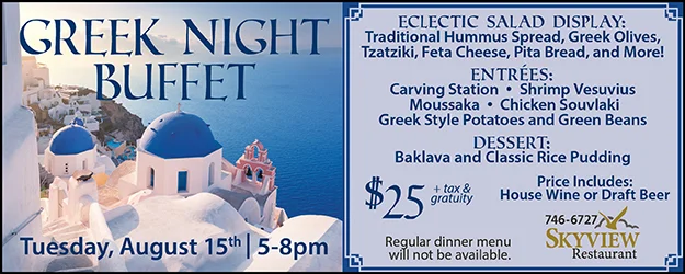 Skyview Restaurant has some exciting Tuesday night dinner specials planned for the month of August. You won’t want to miss their Greek Night on August 12 or the Asian Feast on August 29.