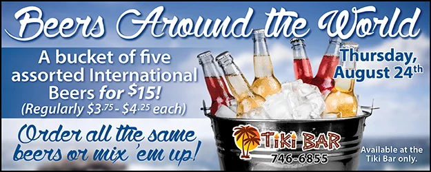 If those mixers and the warm weather aren’t enough to get you to the Tiki Bar this month, you might want to visit for their Beers Around the World special on Thursday, August 24 or the Fantasy of Flights Wine Night on Tuesday, August 29.