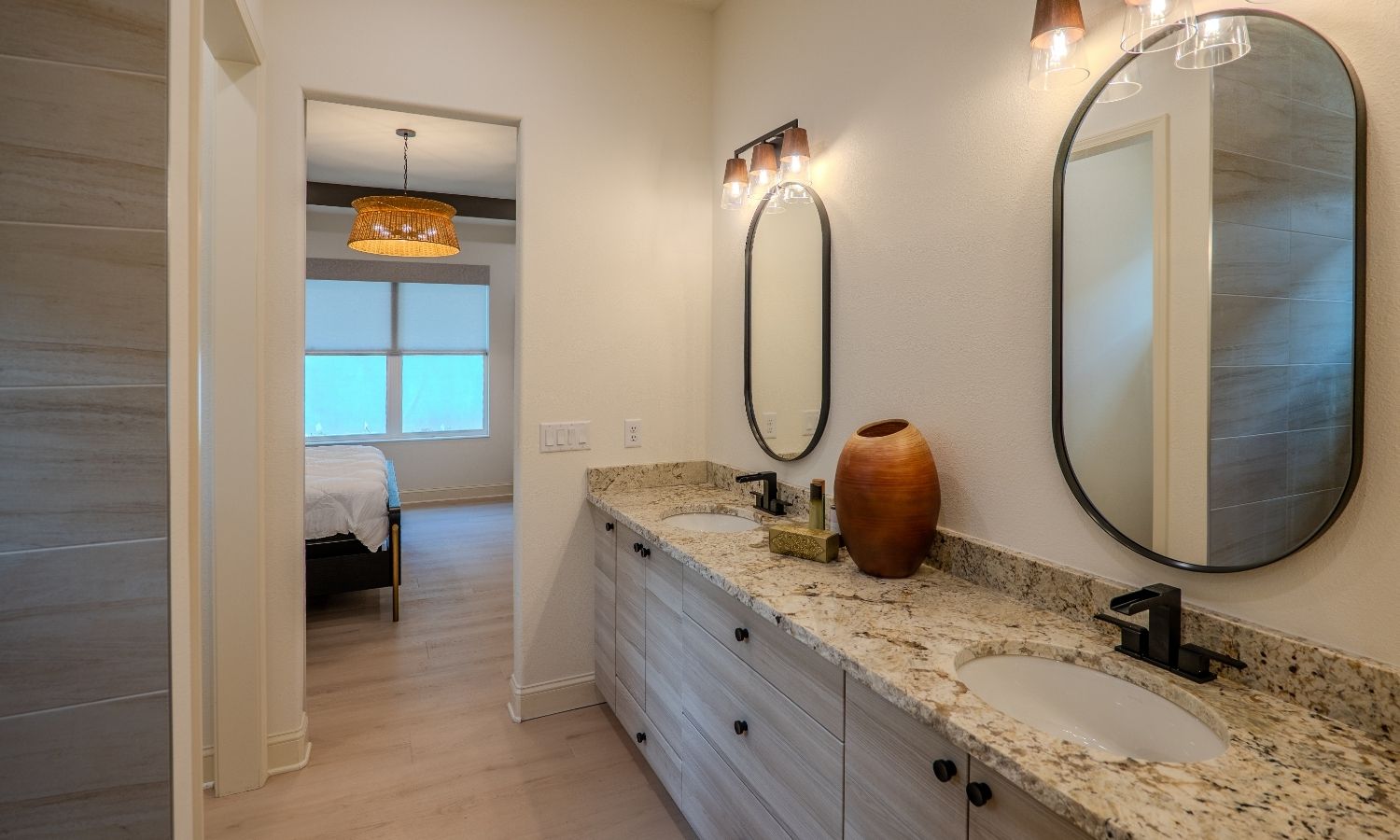 - Quartz or granite countertops