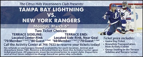 The first big event of the month will be the Vacationers Club trip to Tampa to see the Tampa Bay Lightning host the New York Rangers on Monday, March 6. There are two seating options available, both include round-trip transportation to the game.