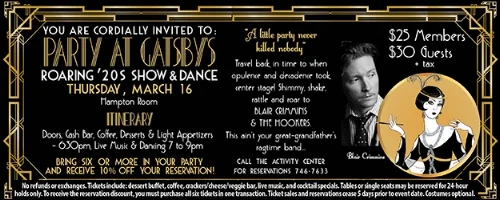 Another fun event that is planned for the month of March is the Party at Gatsby’s in the Hampton Room on Thursday, March 16. Blair Crimmins & The Hookers will be rocking out all of your favorite ragtime hits, and there will be coffee, desserts, and light appetizers served.