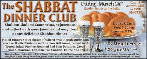 The Shabbat Dinner Club will be back in action on Friday, March 24 in the Garden Room at The Grille. Dinner for this event will include your choice of Sliced Sirloin with Mushroom Sauce or Broiled Salmon with Lemon Dill Sauce along with side dishes and Key Lime Pie for dessert.