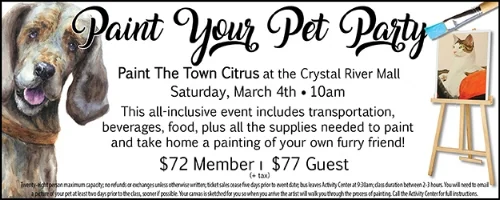We mentioned last month that you don’t want to miss out on the Paint Your Pet Party at the Crystal River Mall on Saturday, March 4. Residents will be provided with transportation to the event, food and drinks at the event, and all the necessary supplies for a ticket price of $72.