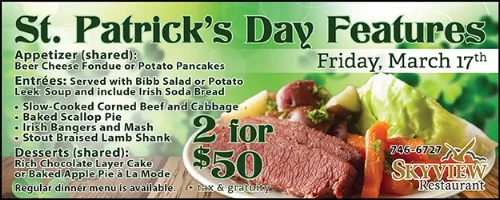 St. Patrick’s Day is on Friday, March 17, and both Skyview Restaurant and The Grille have big specials planned for the occasion. Skyview Restaurant will be serving Corned Beef & Cabbage, Baked Scallop Pie, Bangers & Mash, and Stout Braised Lamb Shank, while The Grille is going to be cooking up Corned Beef & Cabbage, Braised Lamb Shank, Black & Tan Pork, Scallop Pie, and Irish Steak.