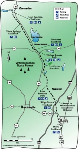 The current trail runs from Citrus Springs down to within six miles of Dade City, for a total of 46 miles. The trail takes its visitors through everything from suburbs, to small towns, to historic landmarks. The trail is popular for walking, biking, and skating. It also has areas where horseback riding is available. There are many locations along the trail that feature a wide variety of dining and hotel accommodations.